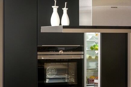 Schwarz kommt auch in der Küche gut. Der eine oder andere Trendforscher behauptet sogar: Schwarz wird das neue Weiß. Eins steht fest: Schwarz lässt sich genauso gut kombinieren wie Weiß. In diesem Beispiel mit hellem Holz, weißer Arbeitsplatte und Nischenvorrichtungen in Edelstahl: insgesamt ein kühles, geradliniges, reduziertes Küchendesign – wie es sich für Designverliebte geziemt.